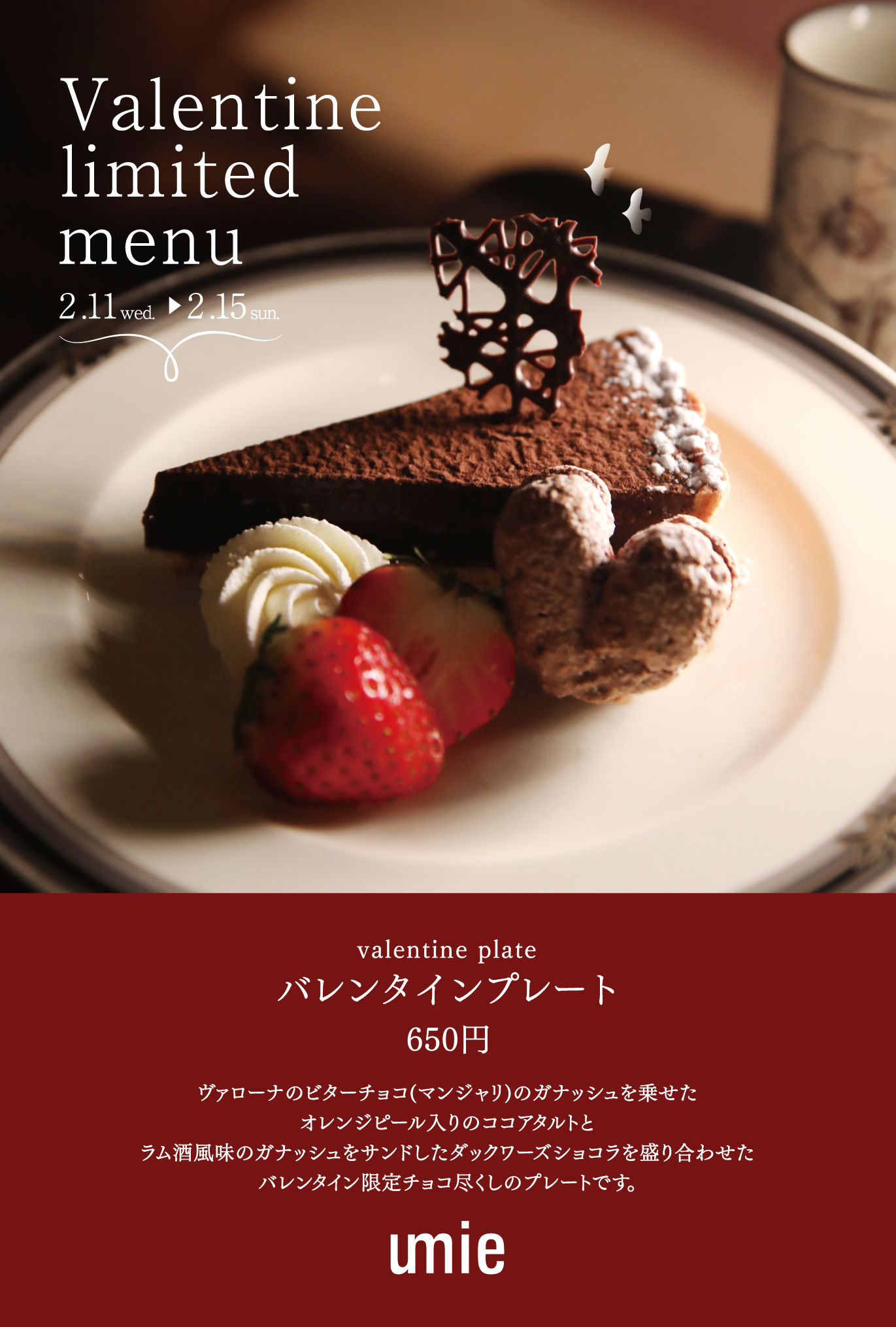 バレンタイン限定プレートが登場します! 2026.02.09 2/11(水) – 2/15(日)期間限定で 濃厚なチョコレート尽くしのプレートが登場します。 ぜひご賞味くださいませ。 ご予約・お取置きは↓ TEL 087-811-7455