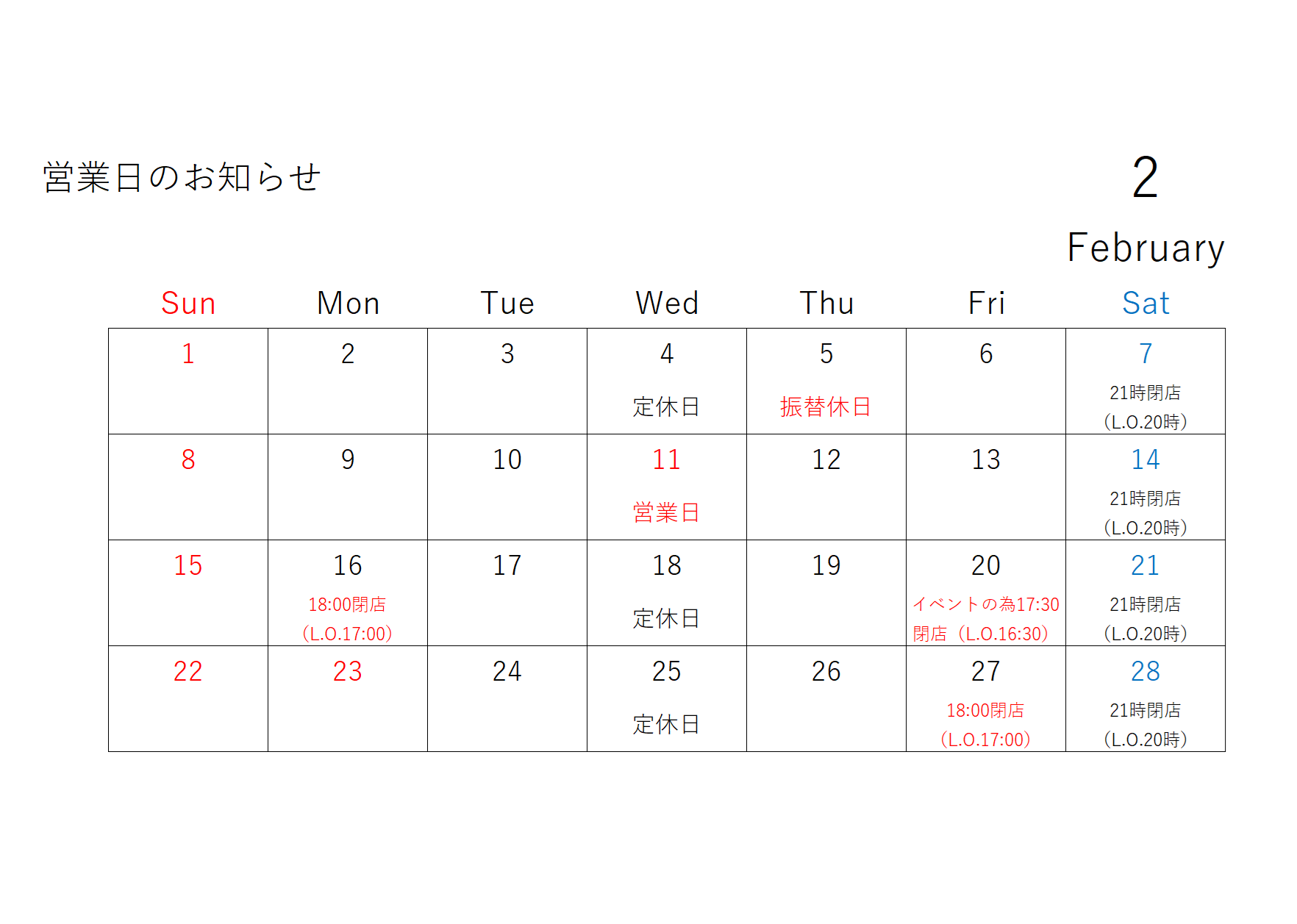 2月の営業日のご案内